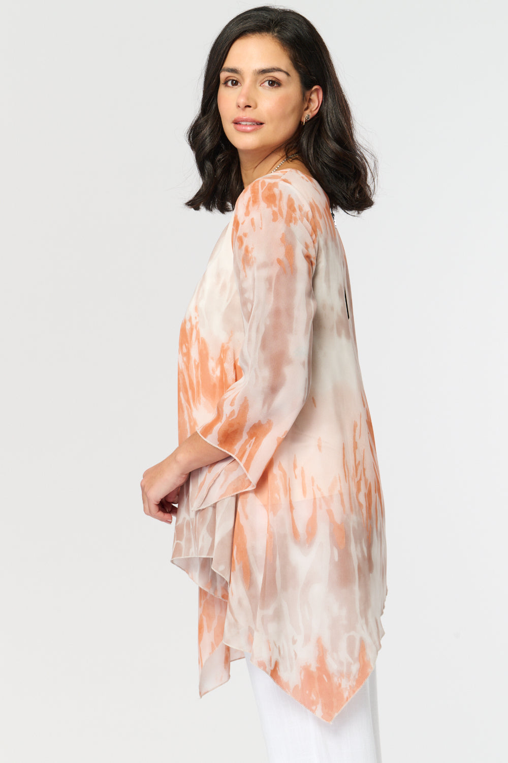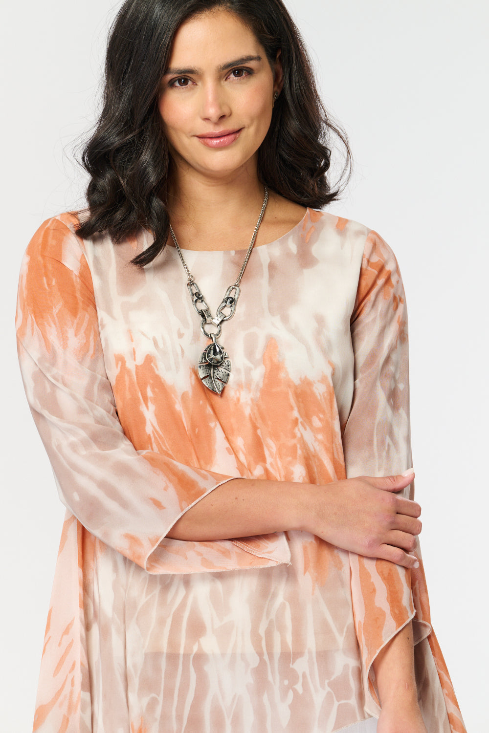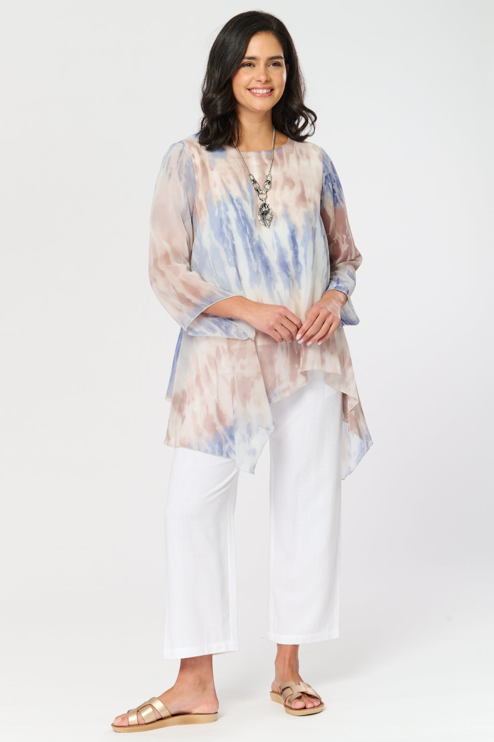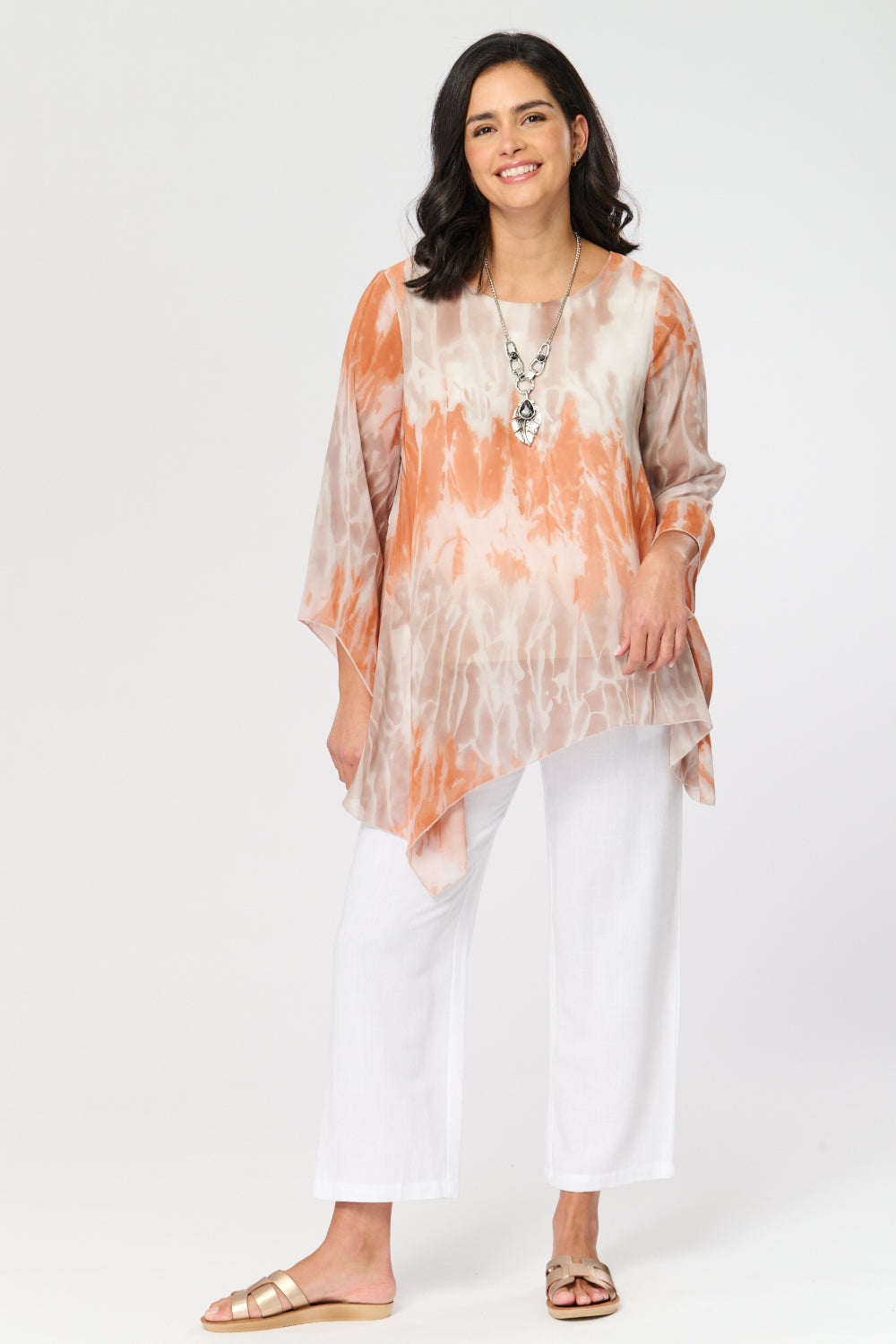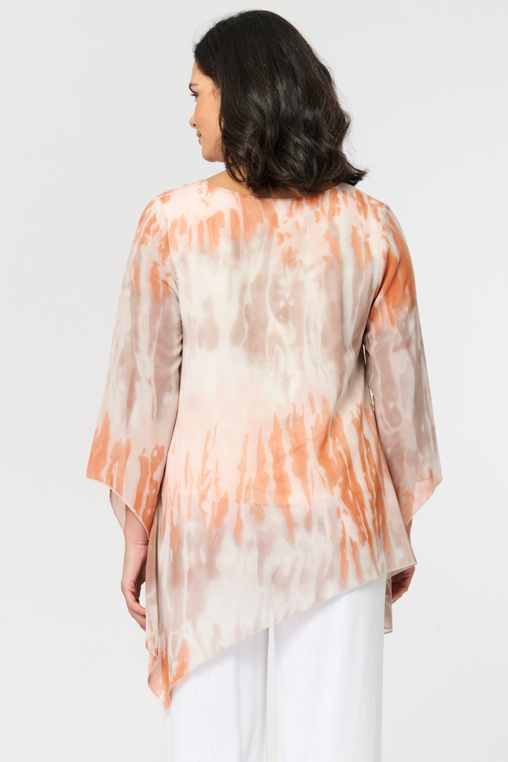 This top offers a unique look with its asymmetric hem and tie and dye design. The viscose lining provides comfort and the angel sleeves add a touch of elegance. Complete the outfit with white trousers and stand out from the crowd.