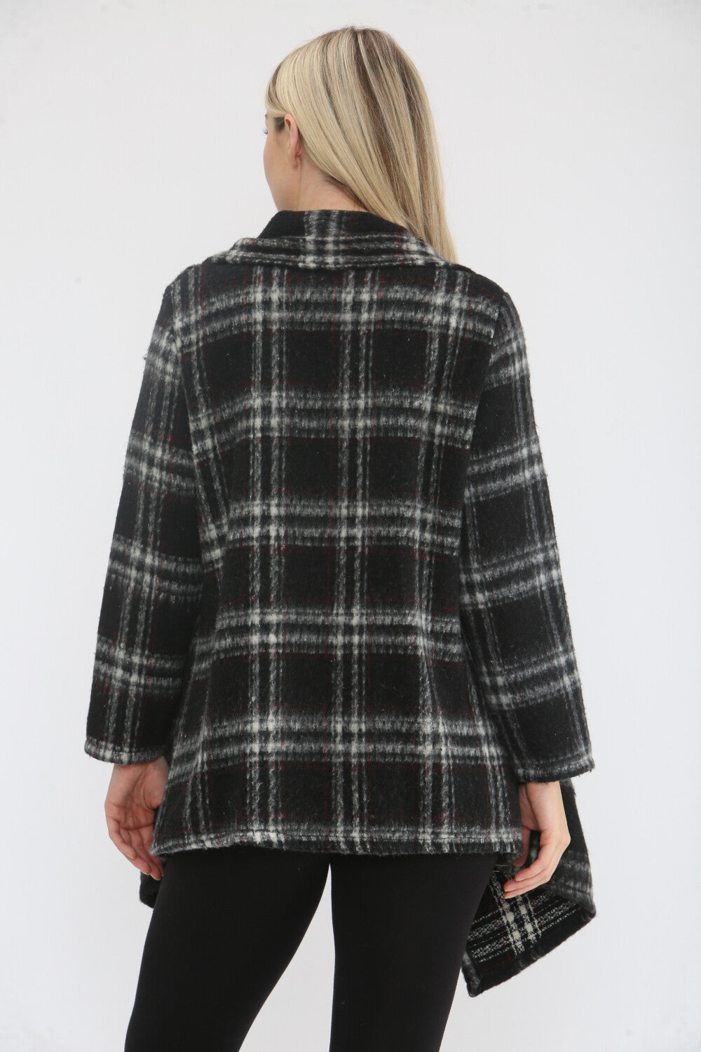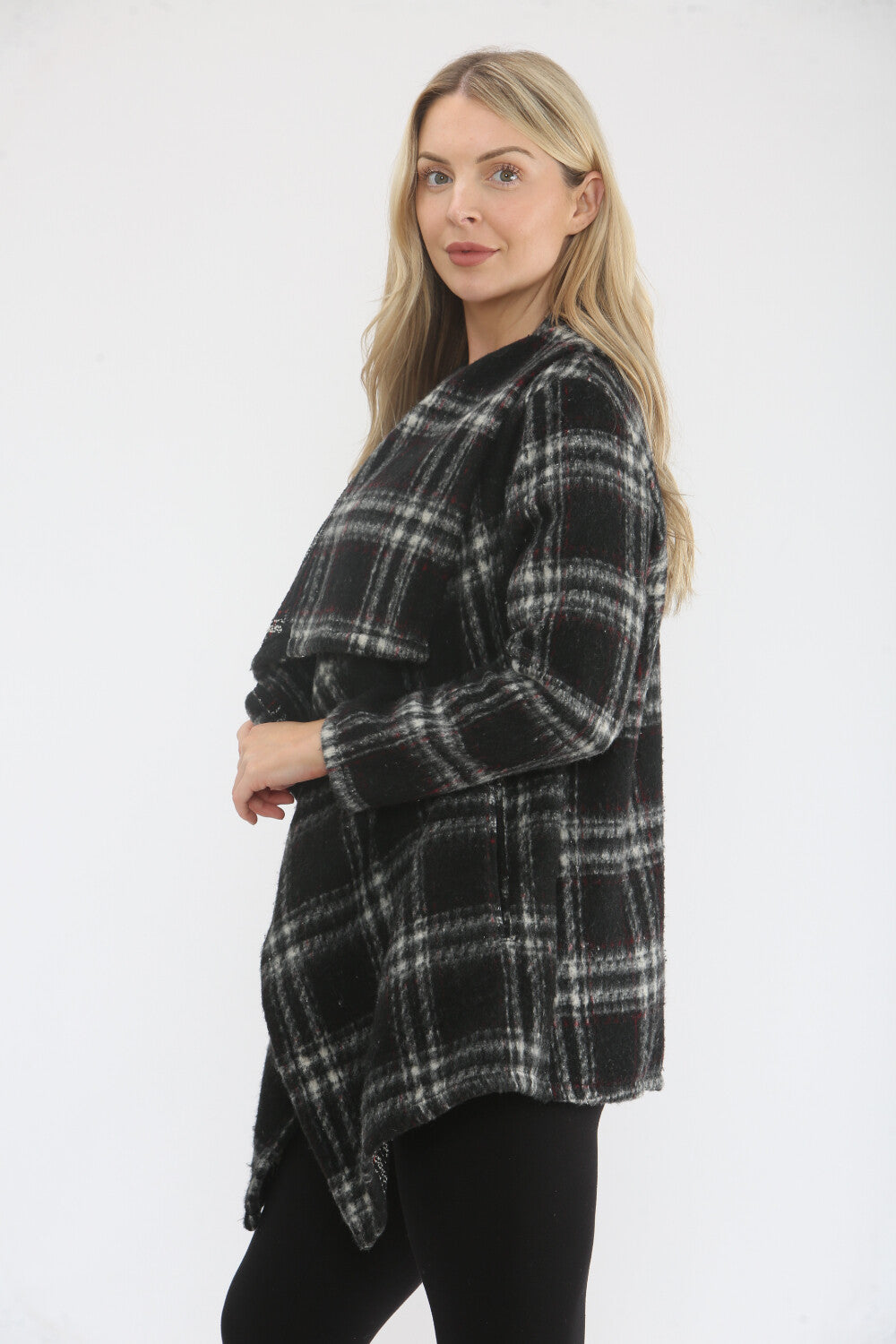 Stay cosy and stylish with this chic plaid open-front lightweight coat. Featuring a timeless black, grey, and white checkered pattern with subtle red accents, this soft, midweight layer is perfect for fall and winter. The draped waterfall front adds a flattering touch, while the relaxed fit ensures all-day comfort.
